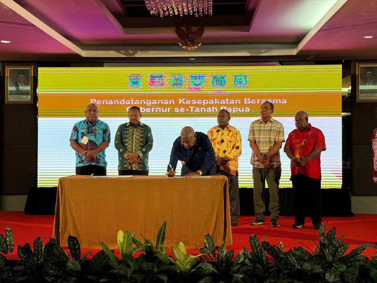 Enam Gubernur se-Tanah Papua di Manokwari, Papua Barat menandatangani Kesepakatan Bersama Percepatan Pembangunan Berkelanjutan (13/02/2026). Kolaborasi ini merupakan kelanjutan sinergi dan koordinasi setelah pemekaran Provinsi Papua menjadi enam provinsi.